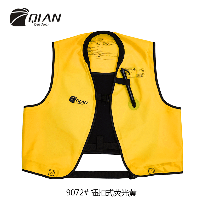 QA-9072 Inflatable Life jacket -Compact design for easy carrying -Oral Inflation/Deflation Tube -Over 170N Newtons of Buoyancy -Suitable for Body Mass of 40kg and Over -Safety colors as Fluo yellow or orange -Adjustable Waistband or zipper
