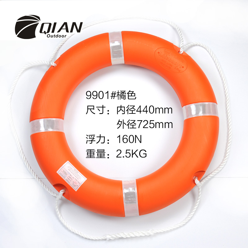 QA-9901 Life Ring Cover: High density polyethylene Inside: Polyurethane foam Outer Dia: 725mm/765mm Inner Dia: 440mm/460mm Thickness: Over 105mm Weigh: Over 2.5kg/4.3kg Buoyancy: Over 14.5kg/18kg Reflective Tape: 4 cycles Color: Orange